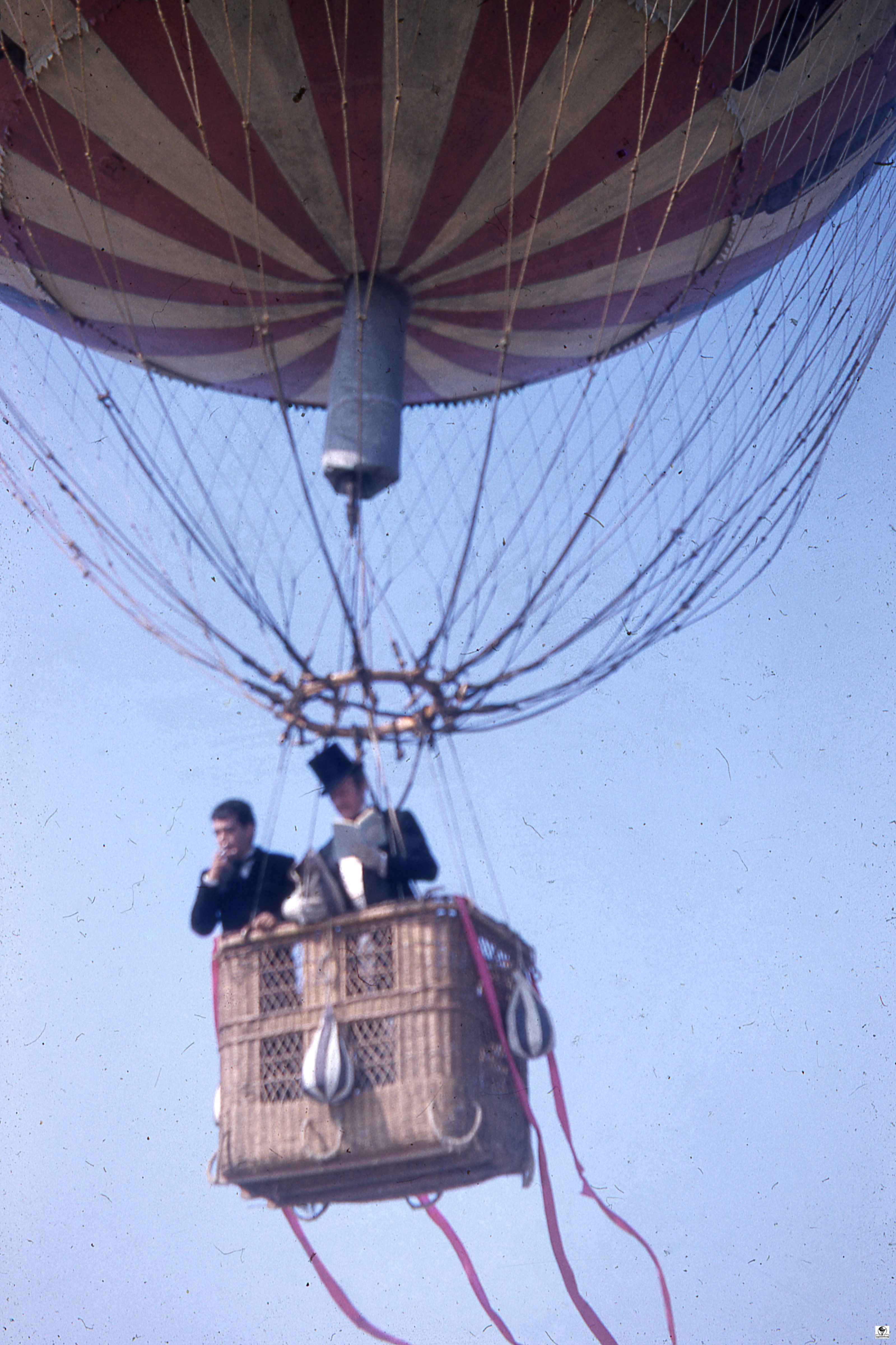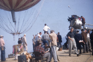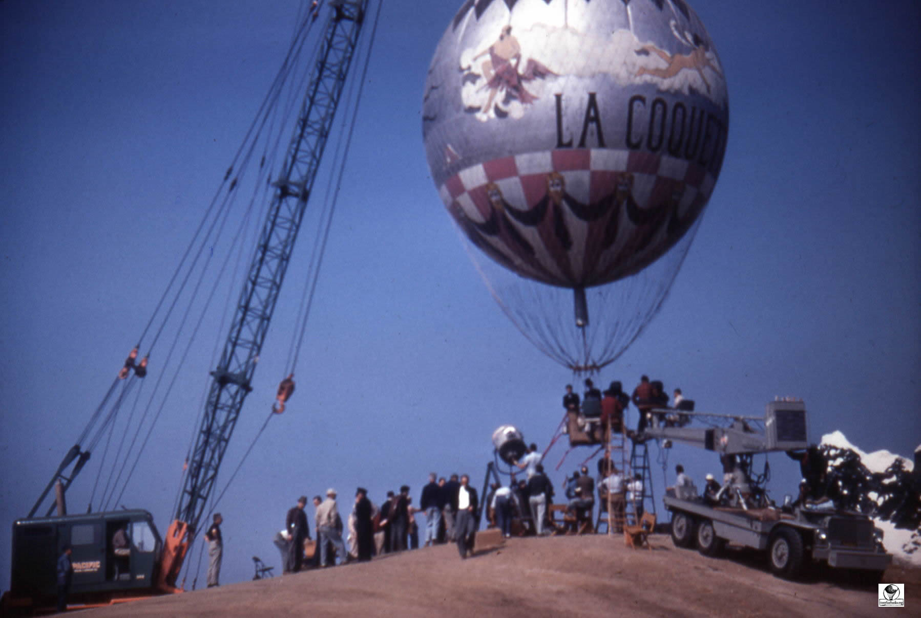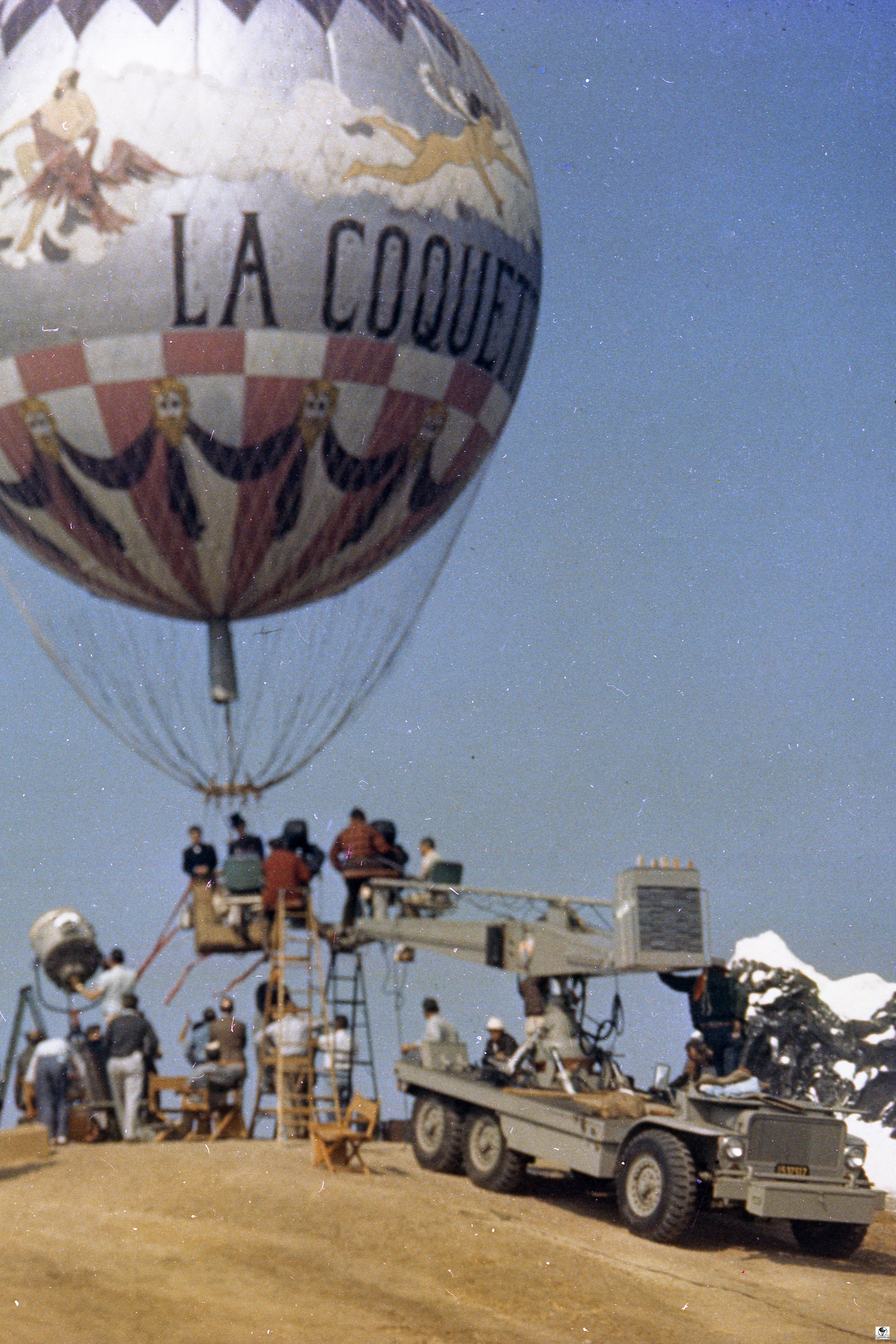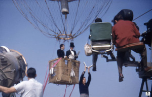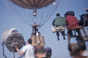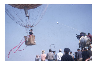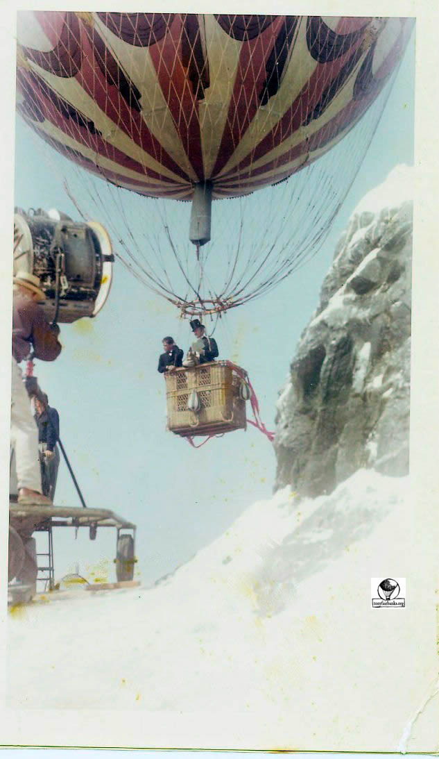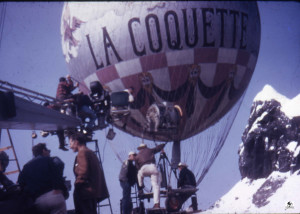 The photographs show the balloon hung by a crane over ‘Alpine mountains made of paper-mache’. La Coquette was never inflated with a lighter than air gas for the filming of the movie. It was pumped full of air with the help of a window fan and suspended from a crane by a rope. The rope was attached directly from the round load ring over the basket through the center of the balloon to the top of the crane.