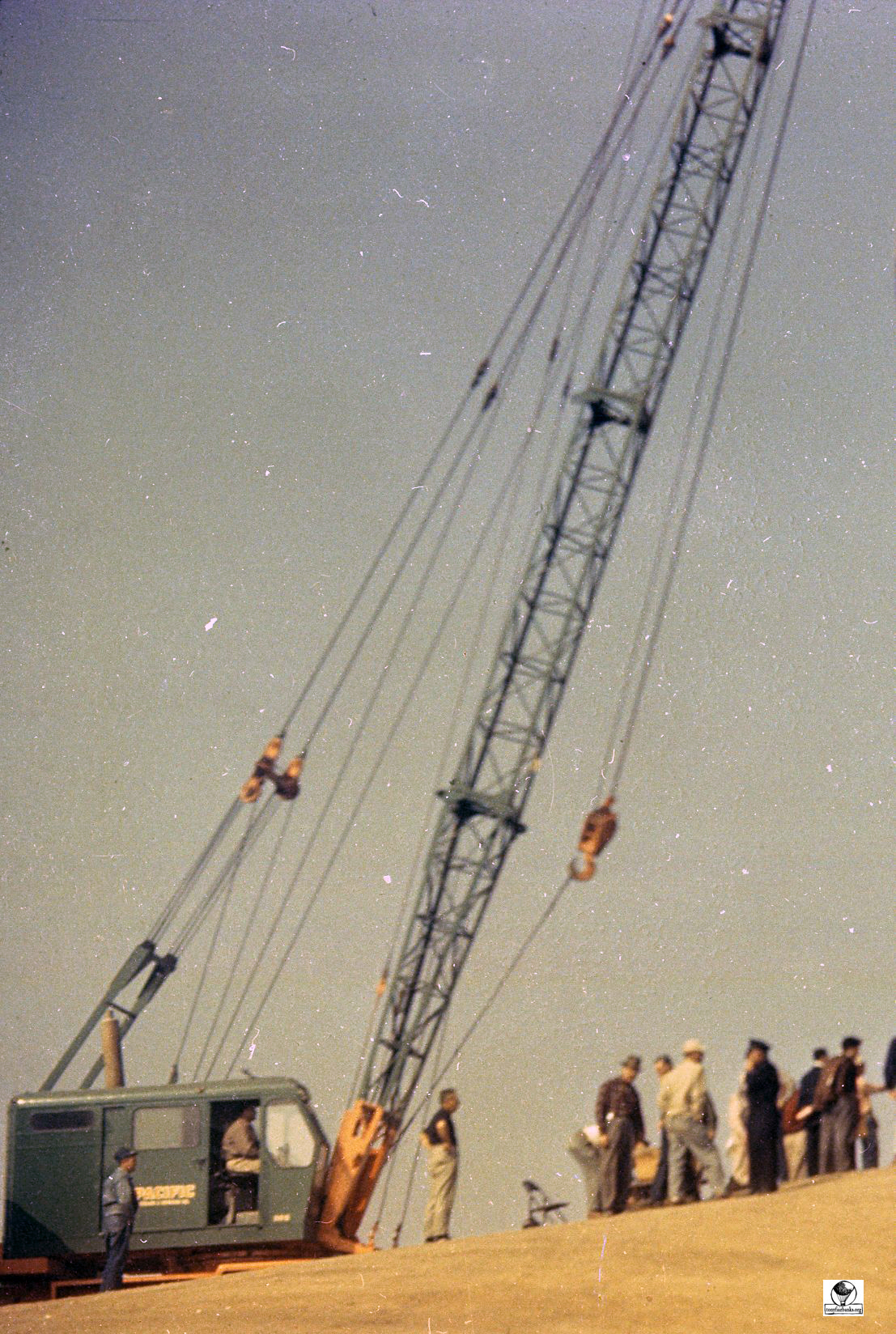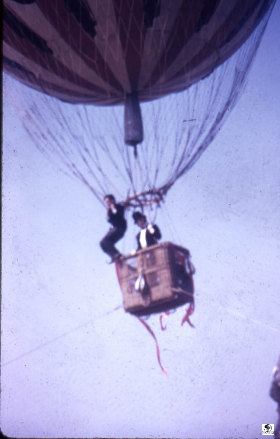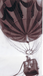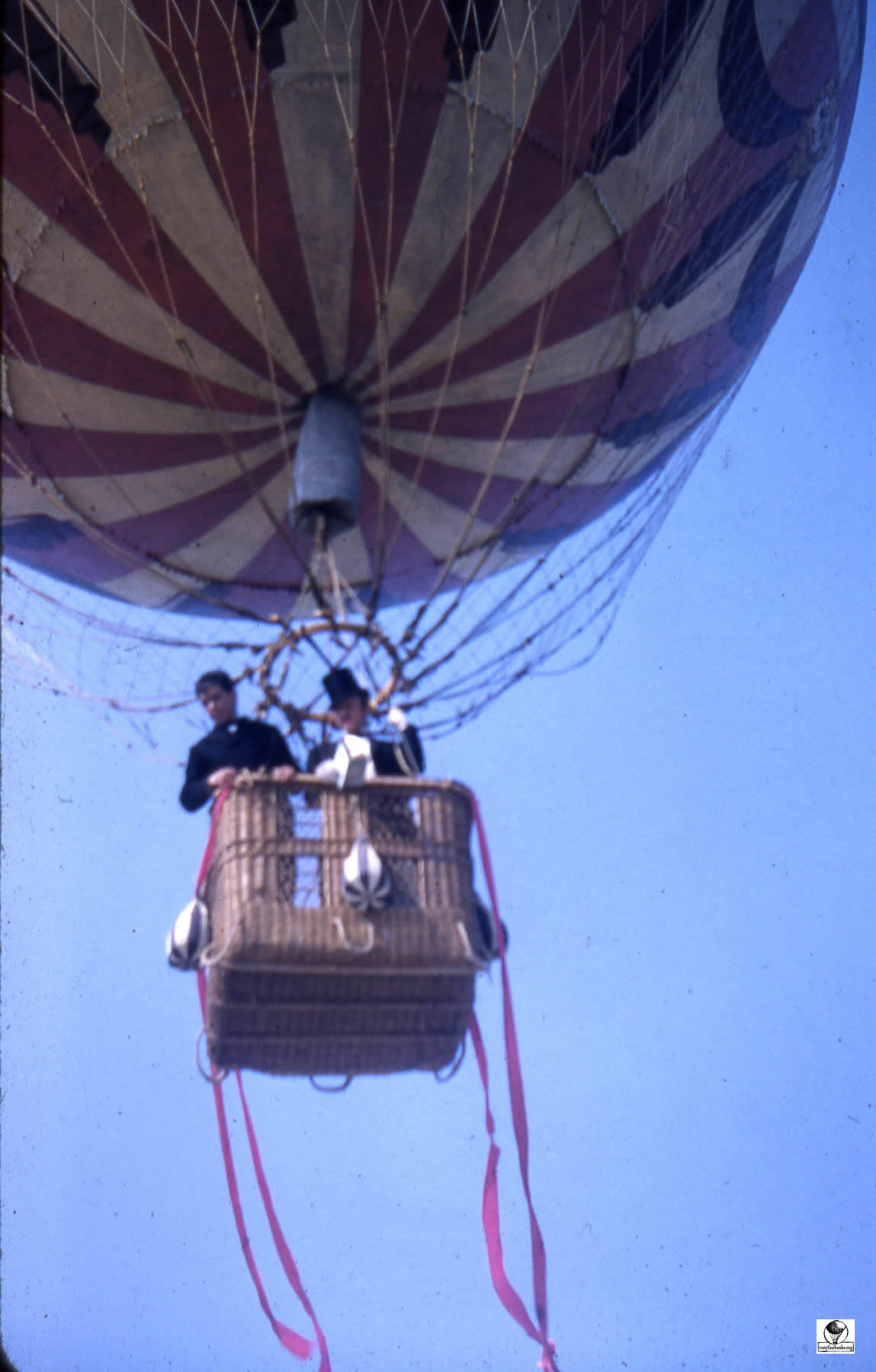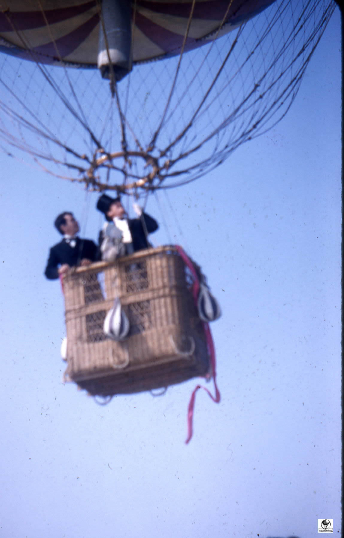 The photographs show the balloon hung by a crane over ‘Alpine mountains made of paper-mache’. La Coquette was never inflated with a lighter than air gas for the filming of the movie. It was pumped full of air with the help of a window fan and suspended from a crane by a rope. The rope was attached directly from the round load ring over the basket through the center of the balloon to the top of the crane.