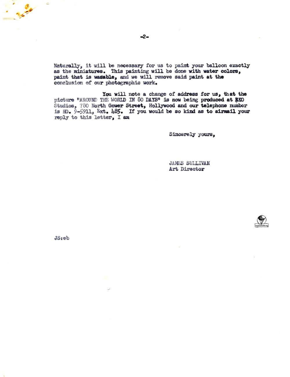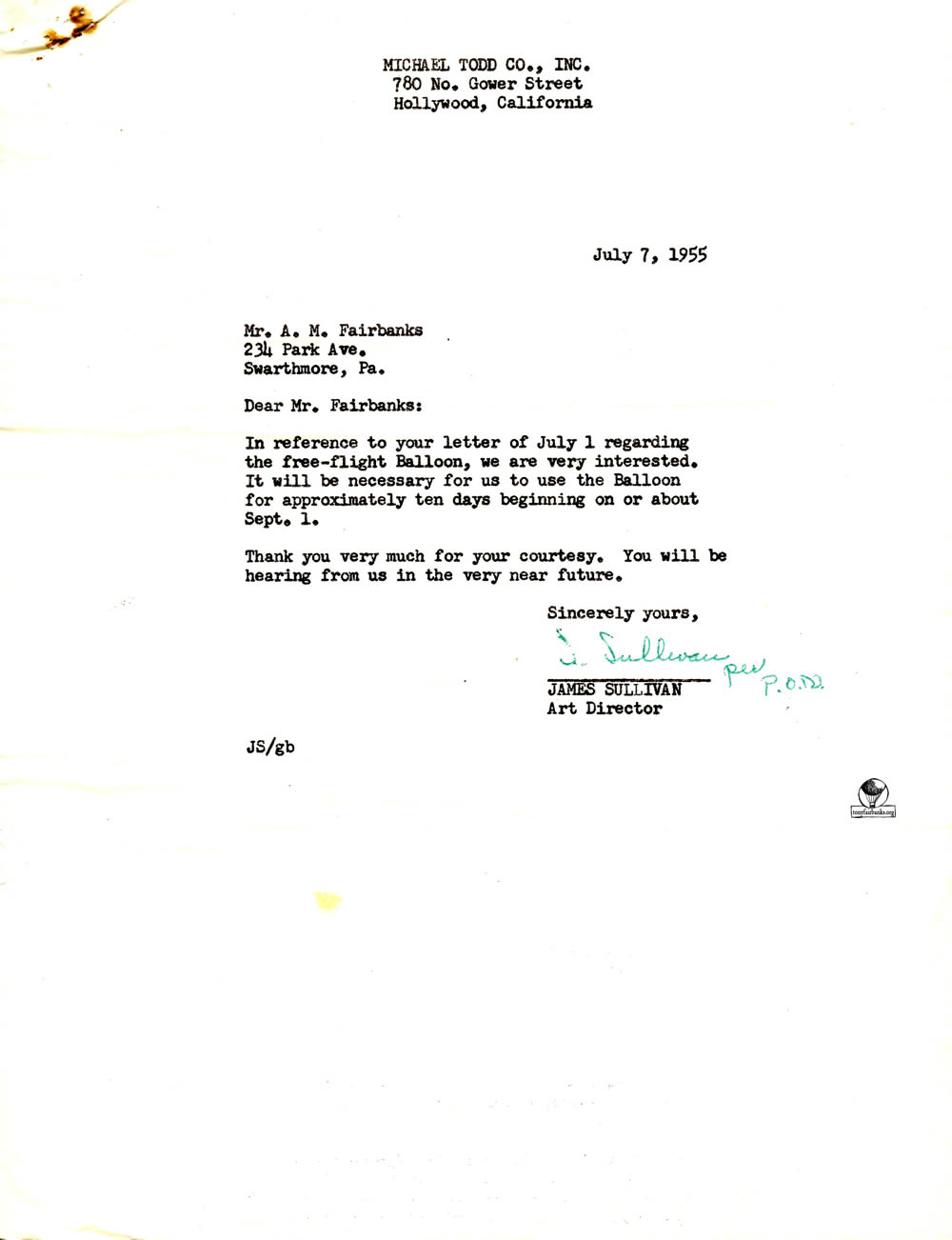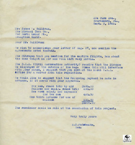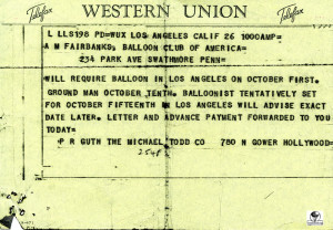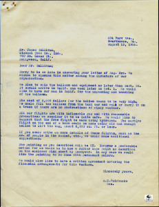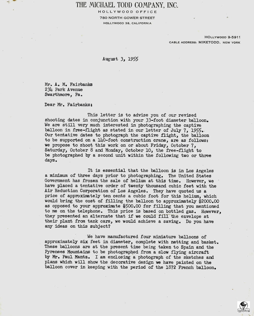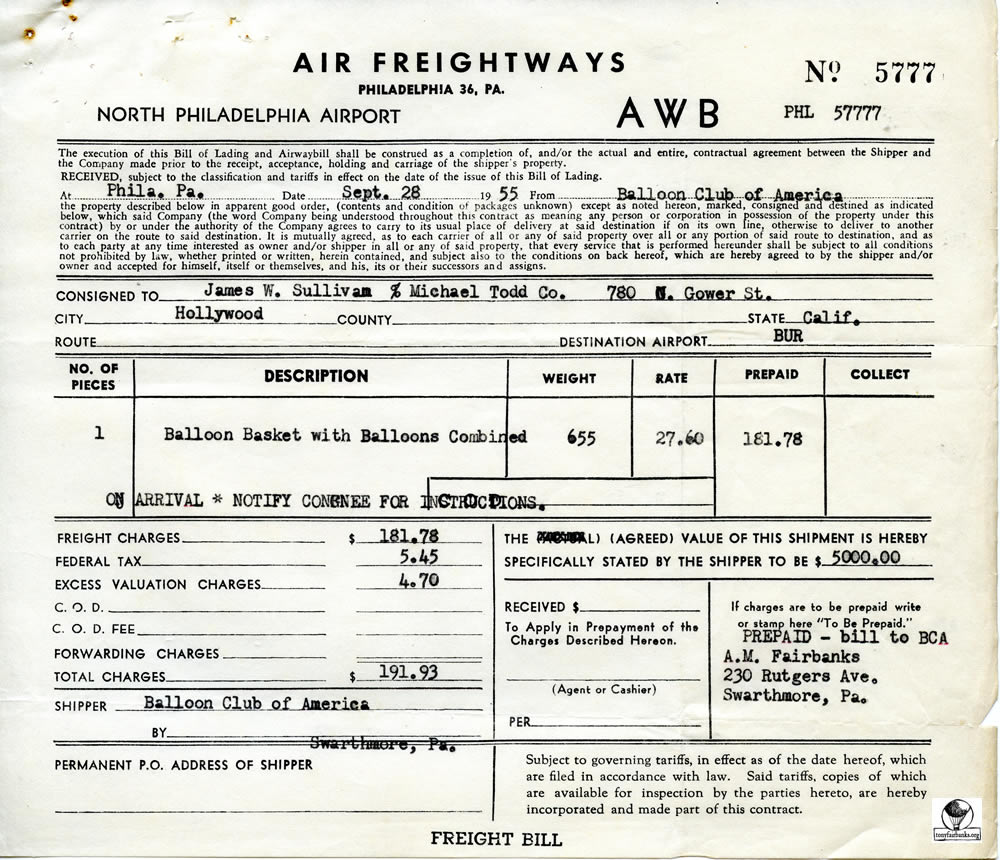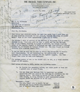 Letters from the Michael Todd Company for the shipping of the silver 19,000 cubic foot balloon. It was to be painted for the movie Around the World in 80 Days and named La Coquette.