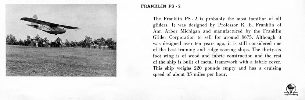 The Franklin glider is a high-wing, strut-braced, single seat glider produced by the Franklin Glider Corporation starting in 1930. It is constructed with a steel tube fuselage and a wooden wing, all covered in doped aircraft fabric covering. The wings lack spoilers of other glide-path control devices and are supported by dual, parallel struts. The landing gear is a fixed monowheel and a skid. See below.