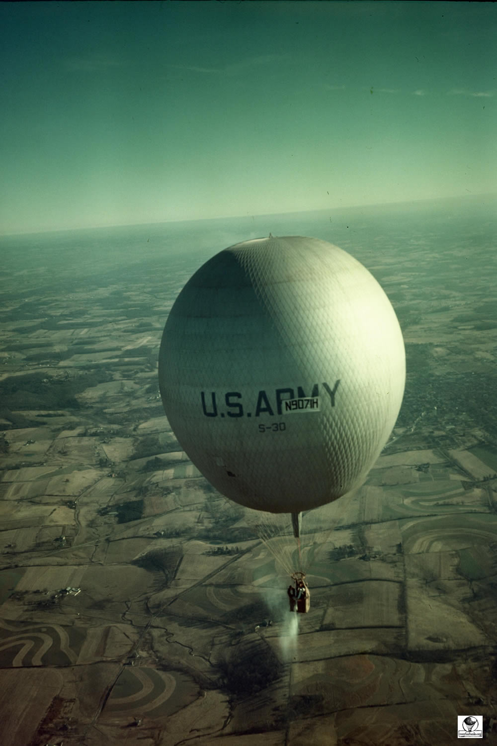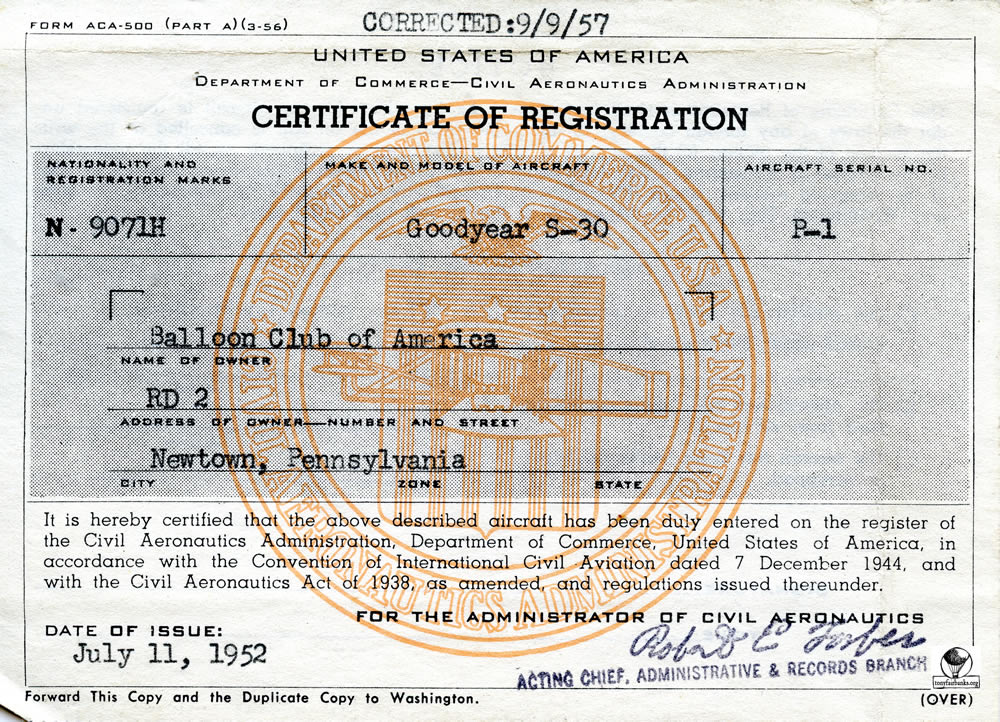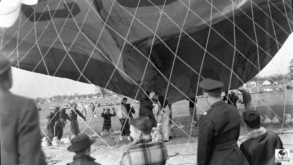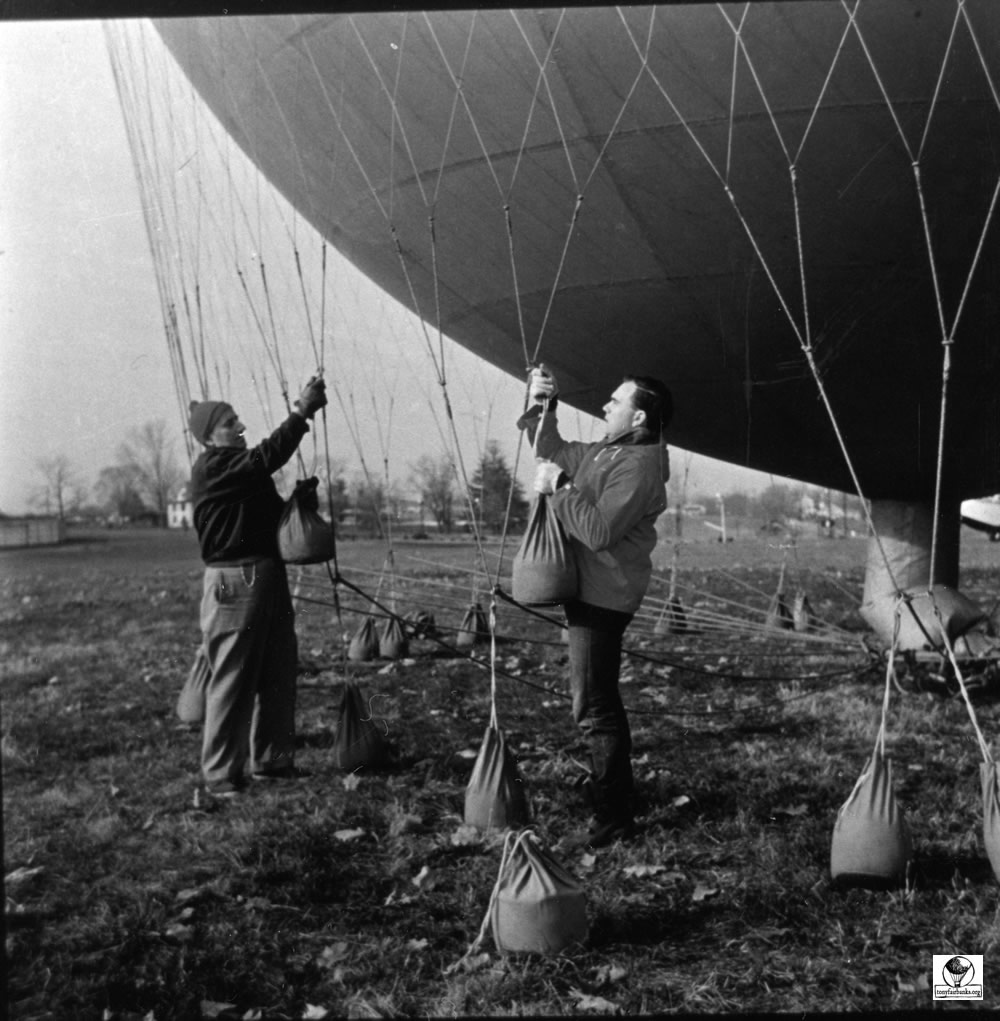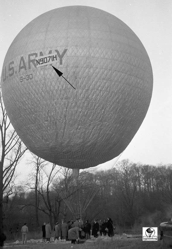 When the balloons were first given an ‘N’ number, the number was on entered on fabric and attached to the net. This was used until the number could be permanently painted onto the envelope. See arrow pointing to the attachment of the ‘N’ number. N9071H is the old 80 (80,000 cu. ft.) balloon.