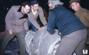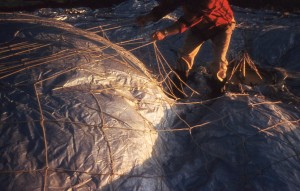 Pete Pellegrino (left) and Tony Fairbanks attach the sixteen foot ropes from the net to the thick wooden load ring.