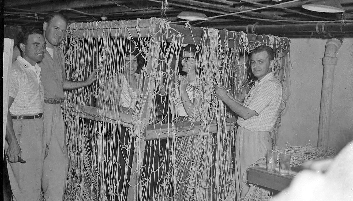 April 1954 – An Artist’s Concept of Free Ballooning Posted on July 13, 2015July 14, 2015 by Martin Beall The club needed a net for one of their balloons – the 80,000. They built a frame called a jig which allows them to make a net (below). (From left – Francis Shields, Jerry burns, Eleanor Vadala, Kate Orensen, Pete Pellegrino)