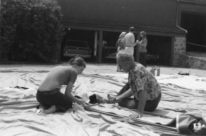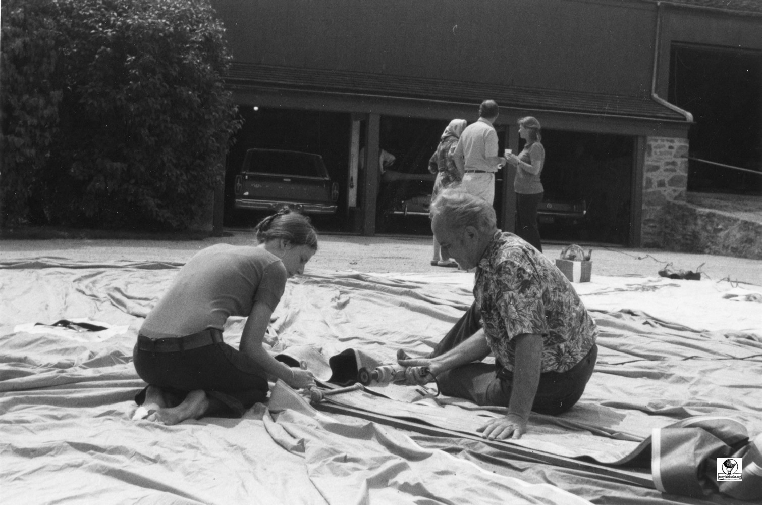 The old glue still sticking to the panel had to be entirely removed. Pieces cut from an automobile tire were used to carefully scrape the glue off the panel without causing damage and later an electric drill with a very soft wire brush attached. Once the panel was cleaned three layers of non-permanent shoe glue were applied to the panel and also to the balloon envelope on both sides of the large hole of which the panel would close. After working together to fit the panel exactly into the balloon to close the opening, rollers were used to assure a tight connection of the panel to the balloon envelope.
