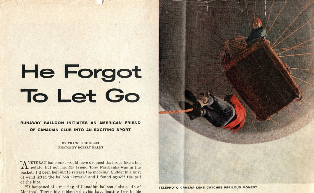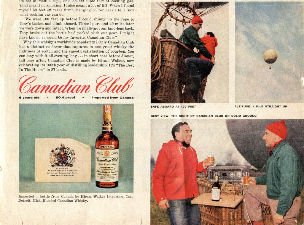 The ad that Mike has in his archives was published in March 1958. The title of the ad is “I forgot to let go of this Runaway Balloon” the location indicated in the ad is south of Montreal. At that time there were no balloon clubs in Canada for “a meeting of Canadian balloon clubs.” Canadian Club Whisky is imported from Canada and therefore a Canadian connection was important to the story about a whisky imported.