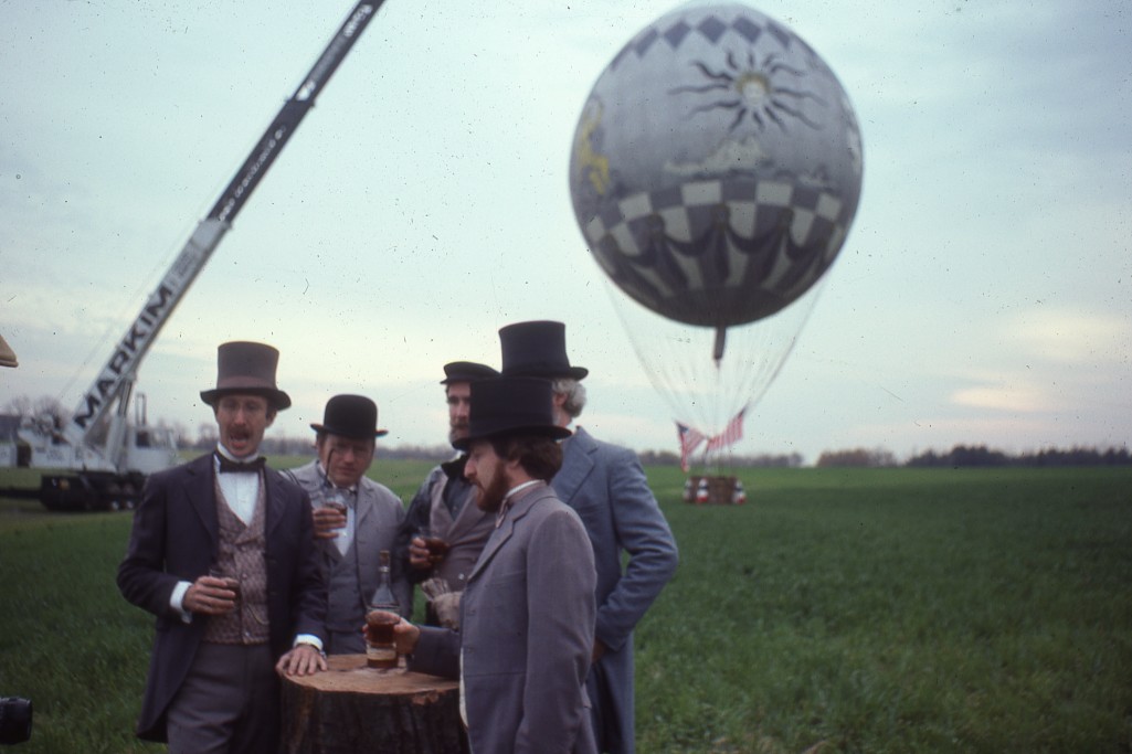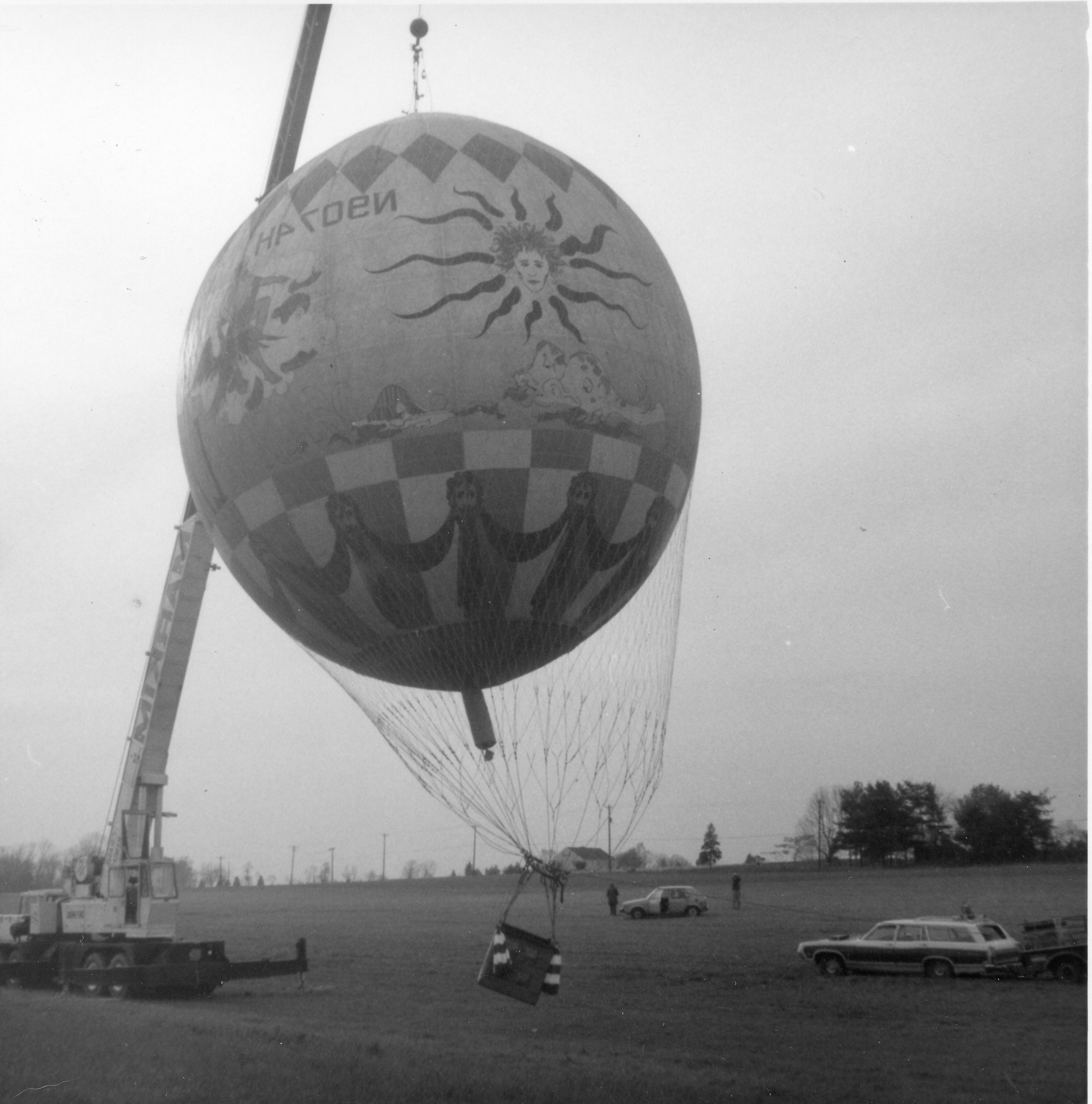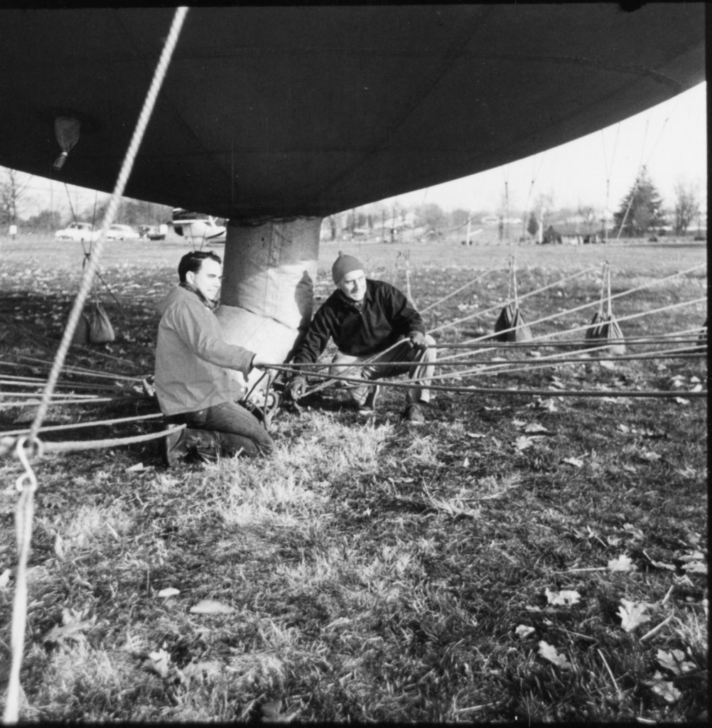 The ground winds were calm and Tony Fairbanks, the senior pilot, decided to have only the single hemp rope attached to the load- ring located above the heads of the pilots. Members of the Balloon Club who assisted in the inflation held the end of the rope. A tether of the balloon above the ground or a free flight into the sky was not planned on this day of photography.