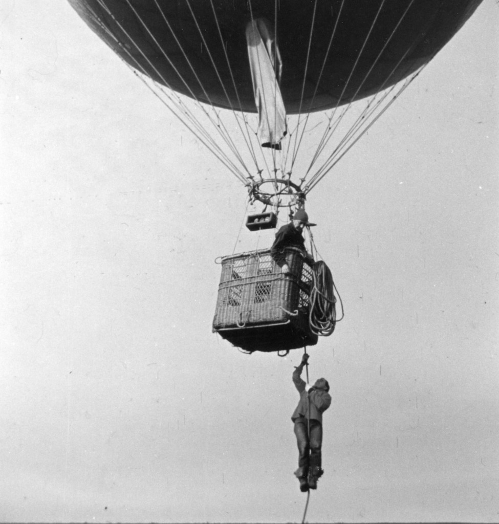 An unexpected gust of wind pushed the balloon into the sky with Francis Shields holding onto the drag rope. Francis held the rope and allowed the balloon to lift him off the ground to add additional weight to the weight of the pilot and sandbags resting inside the wicker basket. At that moment the balloon was in danger of an unplanned launch.