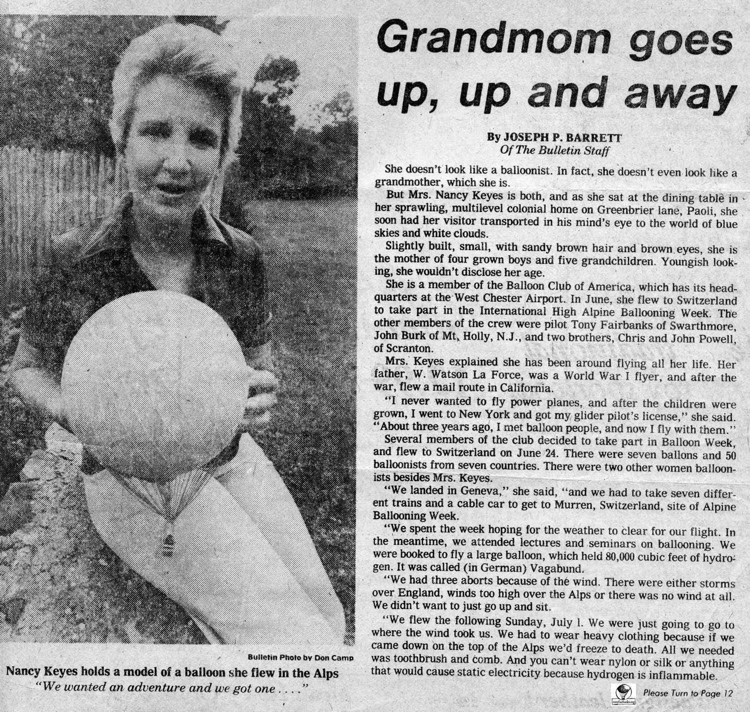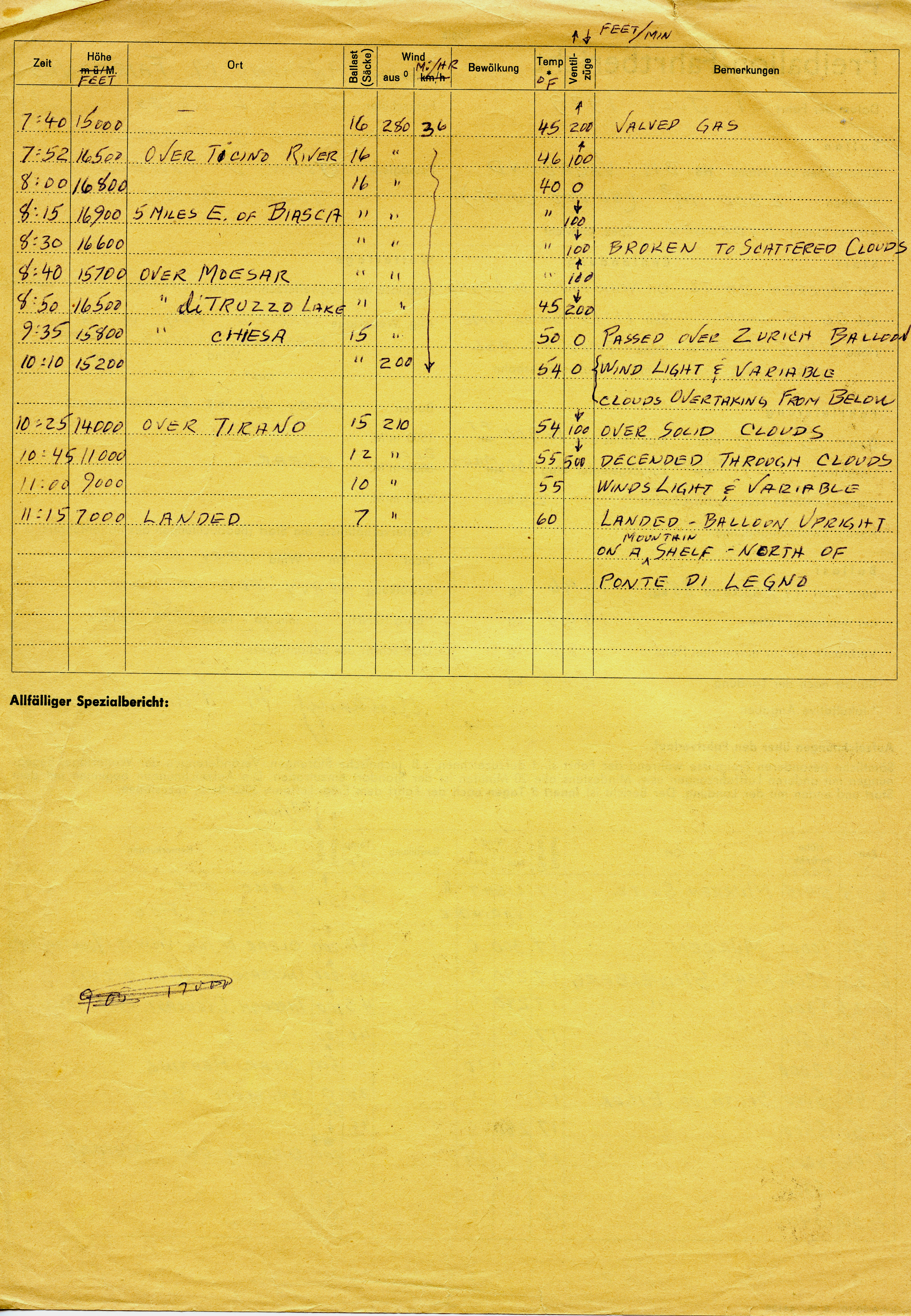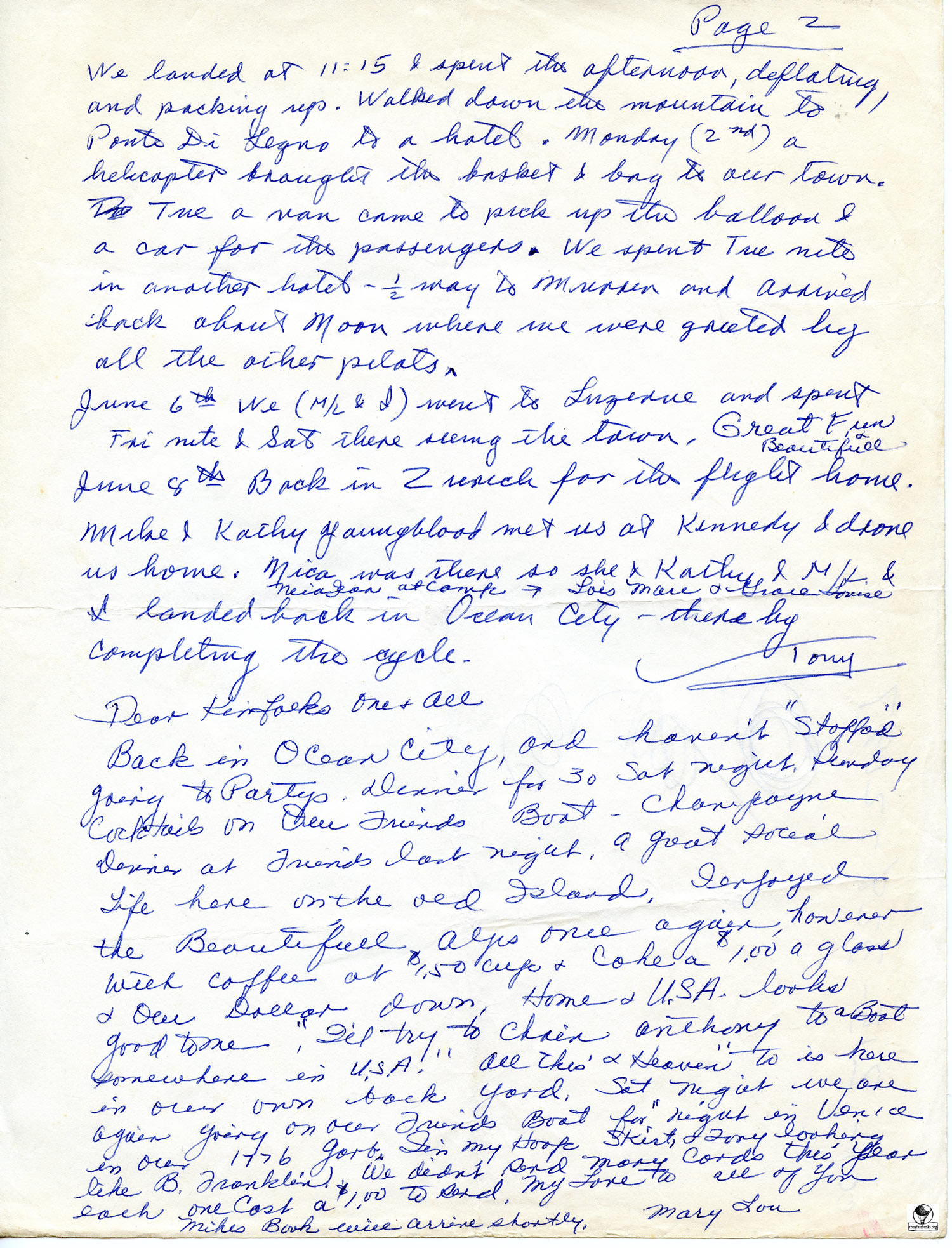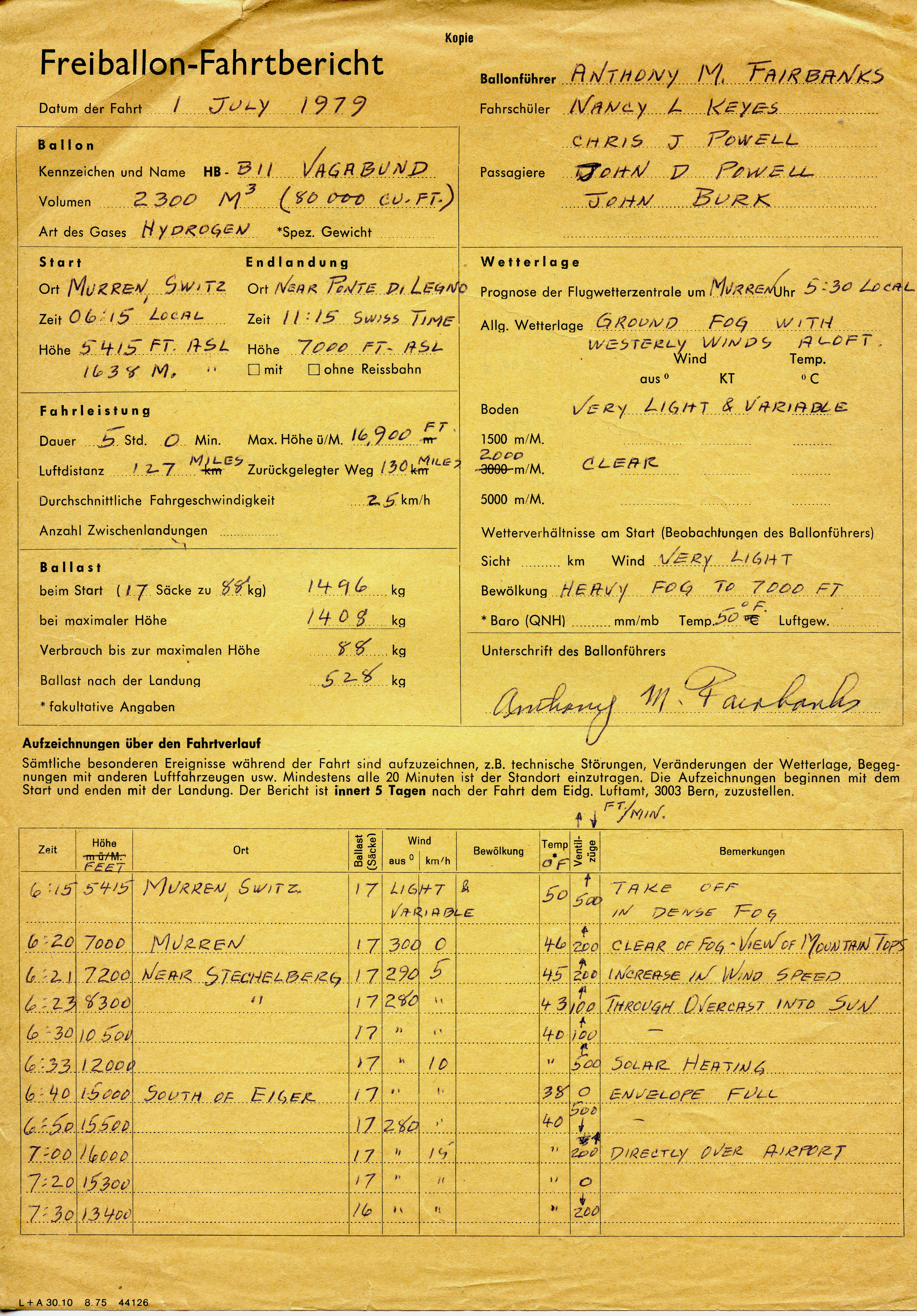 Flew the Vagabund, an 80,000 cu. ft. balloon for 5 hours. They had a stand up landing on a mountain shelf. Tony and passengers walked down the mountain to a town. A helicopter was needed to retrieve the balloon.